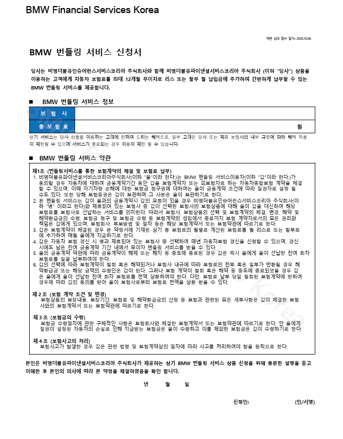 - 자동차 보험 번들링 서비스는 BMW / MINI 금융 상품 이용 시 BMW 인슈어런스 서비스 코리아를 통해 자동차 보험 가입 혹은 갱신할 때 일시납 보험료를 12개월 무이자로 리스 및 할부 월 납입금에 추가하여 납부할 수 있는 특별한 혜택입니다.